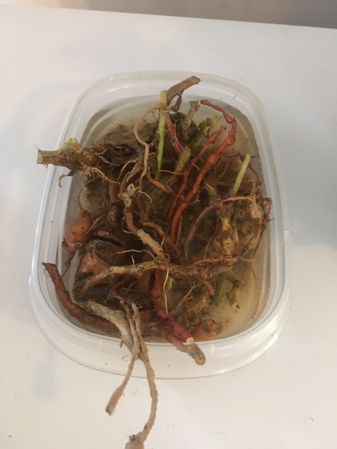 Last year, I pulled up the roots and just planted them in a shallow tray. This year I am trying something a little different. I am cutting the stems from the roots and cutting leaf segments and then placing them in water until they start to sprout roots or leaves respectively. Once they sprout, I’ll transfer the segments into soil This will not only make transplanting into the shallow trays easier but will also make it easier to plant the young plants in the garden come spring.