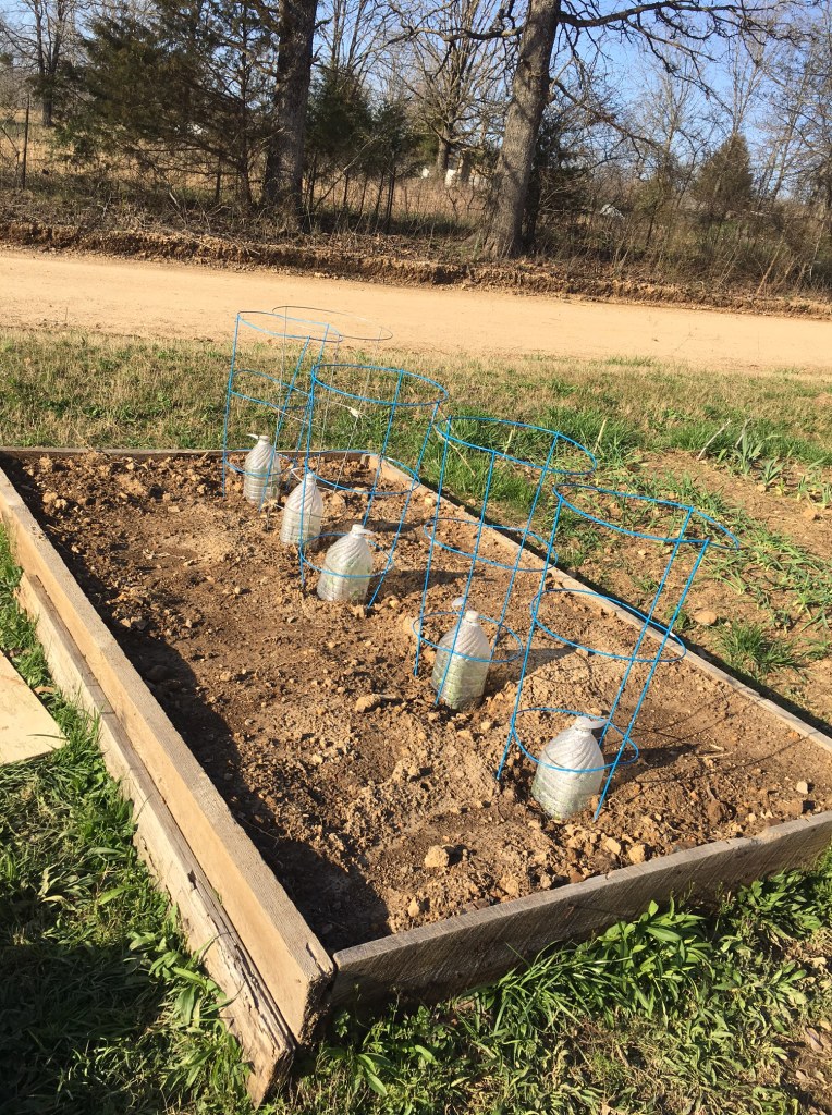 We’ve already planted the tomatoes in the middle of the bed and put cages around them so that they grow more vertically. We put water containers with holes cut out of the bottom to keep them warm enough not to freeze during frosts that are sure to come. At night we remove the caps from the jugs and during the day we take them off so that the tomato plants can breathe. We want to get the tomato plants well established before we put in the pepper plants. For more information about planting tomatoes see my post on this blog: Healthy Tomato Plants from Seed
