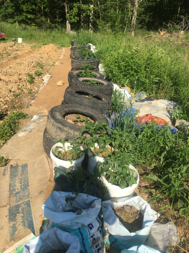 A lot of the garden is up, but the rain did cause some plants to drown. We had to replant the potatoes that we planted in the ditch, and I replanted some of the corn and still have more that I need to fill in.