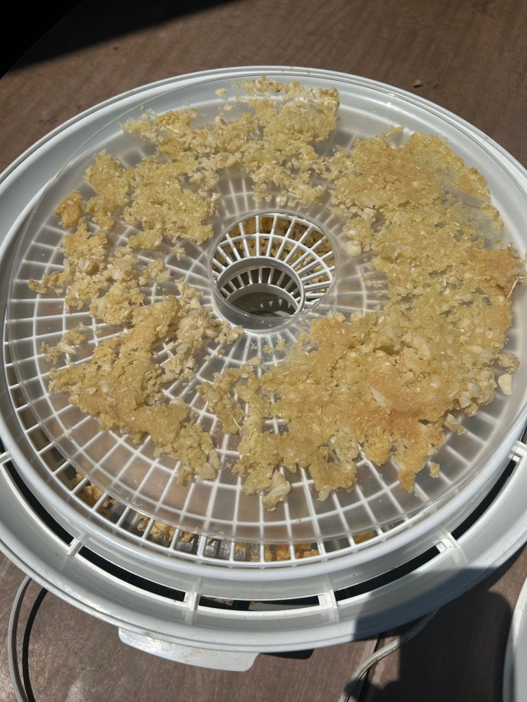 Once the garlic was minced, I poured the garlic into my dehydrator to dry. I put the minced garlic in thin layers on the dryer sheets so that the garlic would dry quickly.