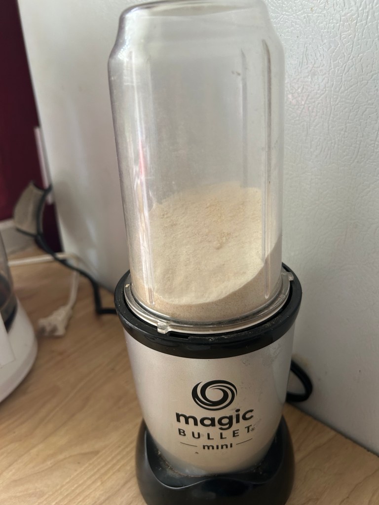 Once the minced garlic was completely dry, I placed the dried clumps of garlic into a smaller food processor. I pulverized the dried minced garlic into powder.